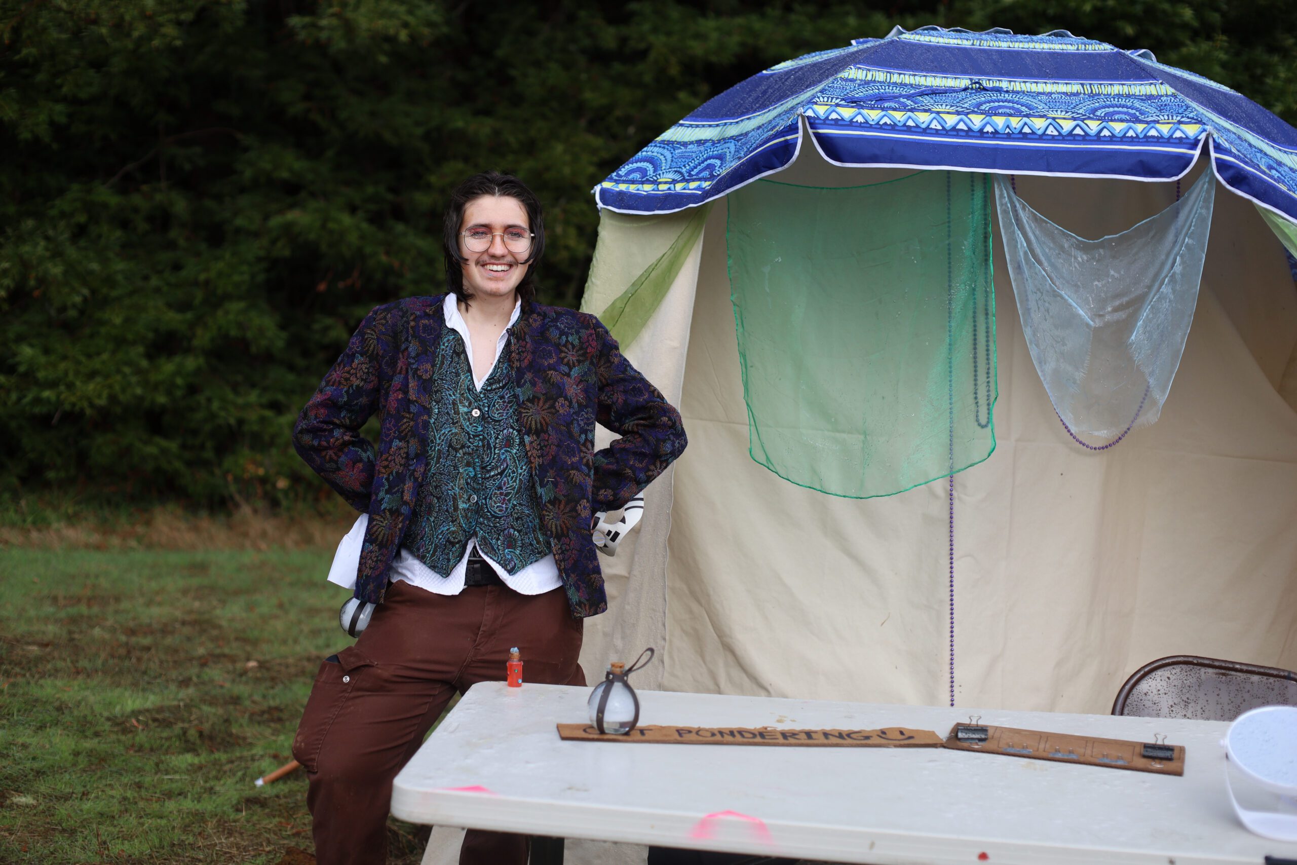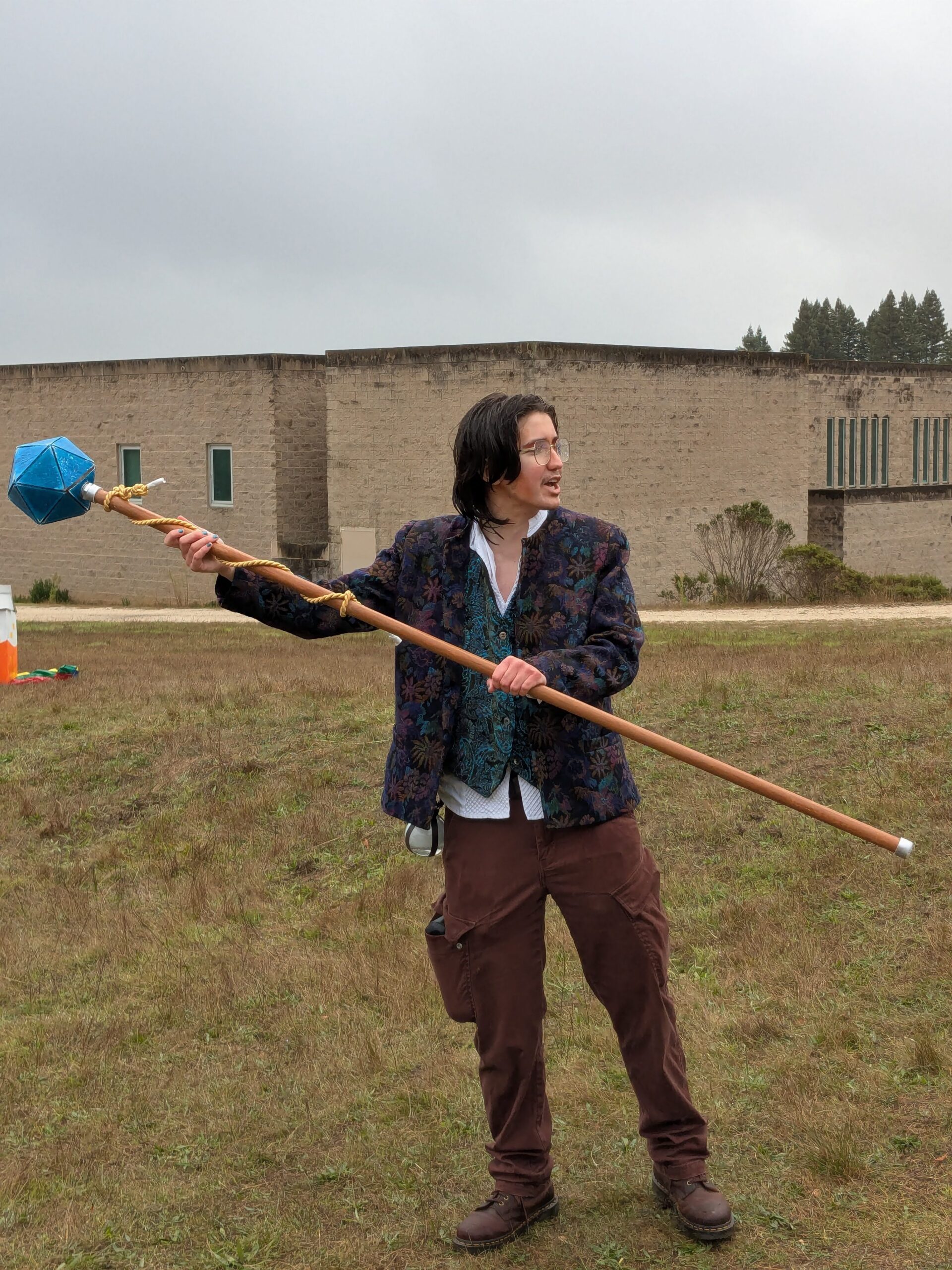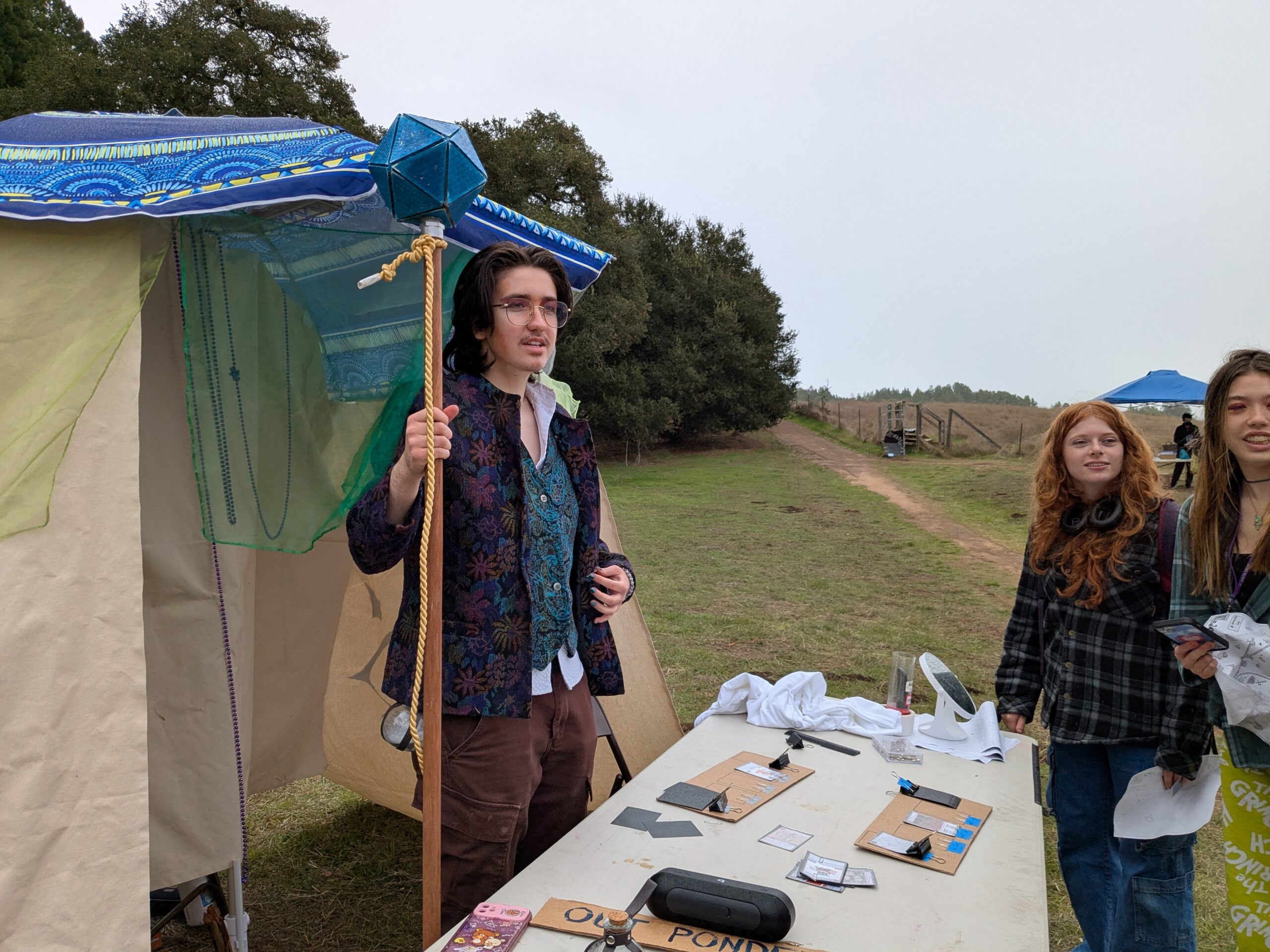 I played an evil wizard in search of pieces of my mystical staff which were scattered across the Playfaire for my “final senior project for the esteemed wizard academy”. Participants were sent on a fetch quest by me to find the pieces in my stead which were possessed by a cast of colorful characters from other dimensions. These included a hobby-horse jousting knight repurposing the staff as a halberd handle, a card cheating cowboy who wont give up the golden lasso unless you can beat him, and my witch ex-wife who lives on the other half of our shared tent just itching to put a curse on me and will exchange the magical orb in exchange for the participant’s help.